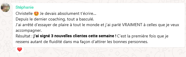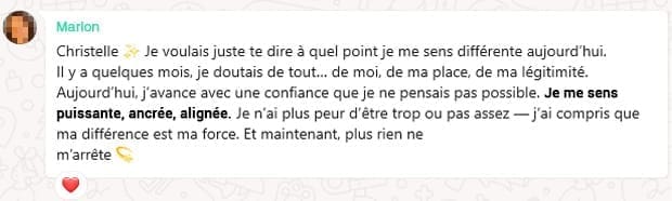 "J'avais besoin d'un accompagnement complet, aussi structuré et qualitatif que bienveillant et spirituel, et je sens que tu incarnes tout cela, Christelle !"